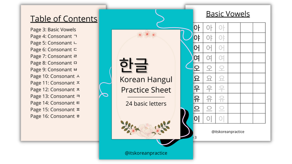 Easy to follow practice sheets to learn Korean Hangul.
